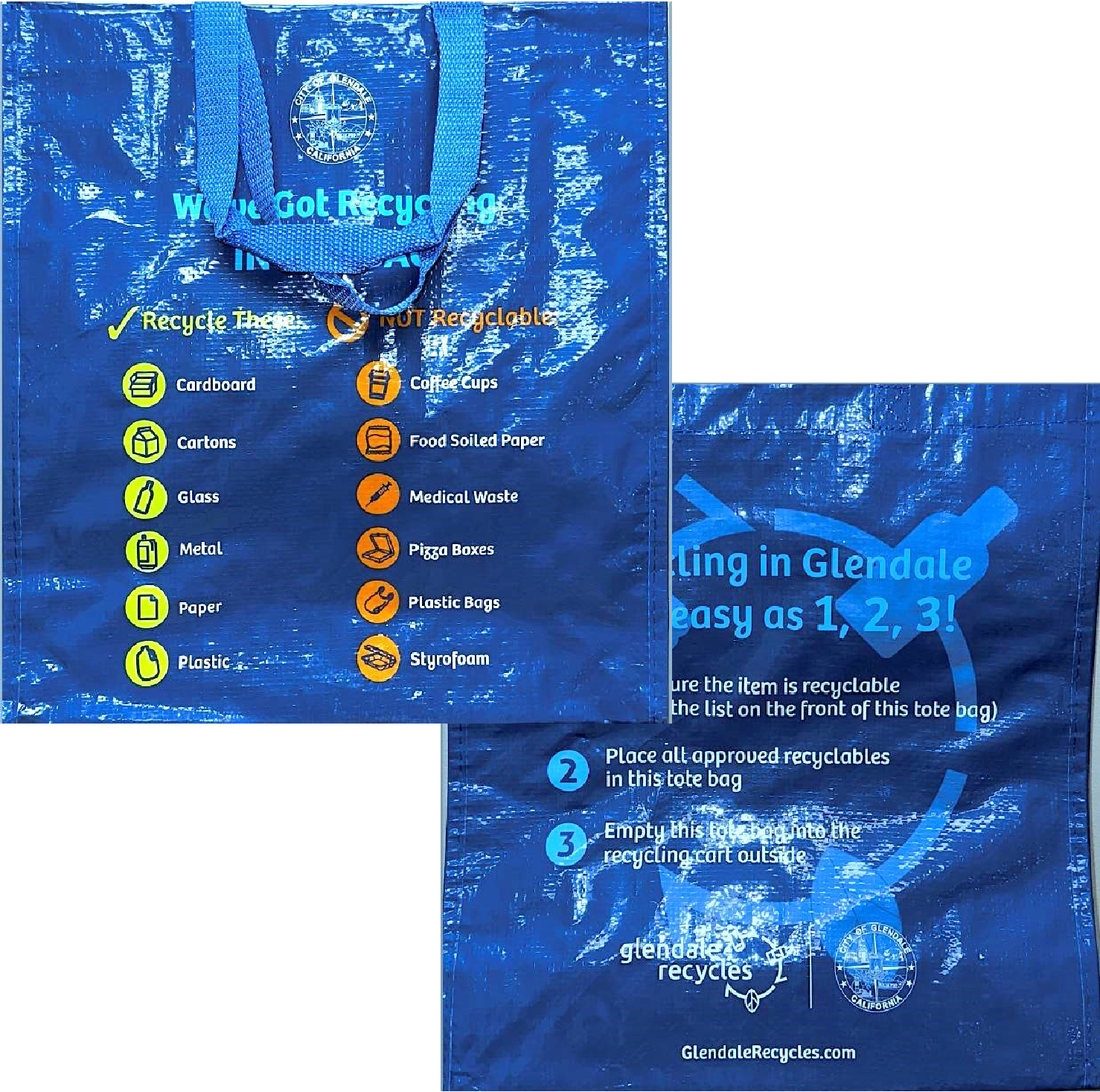 Each Glendale household may receive up to two free tote bags. Bags can be picked up at the Public Works Integrated Waste office (548 W Chevy Chase Drive) on Tuesdays and Fridays between 8:00 a.m. and 3:00 p.m. Please bring a current Glendale utility bill or driver’s license for verification.